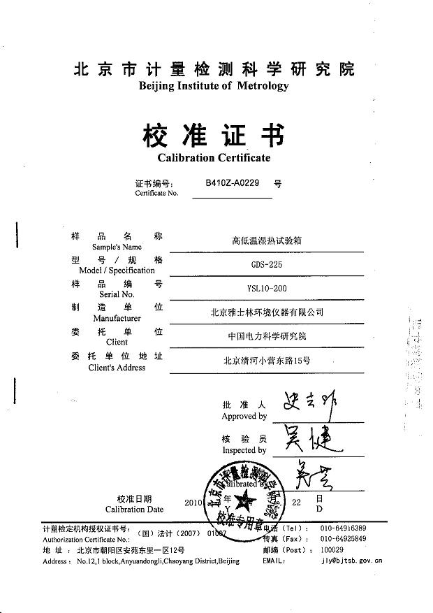 >>高低溫濕熱試驗箱校準(zhǔn)證書-北京計量院-中國電科院1