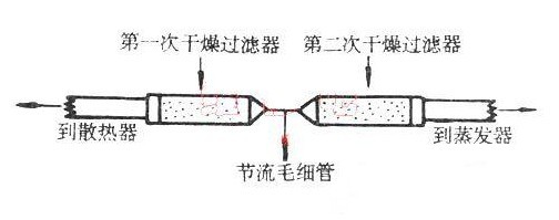 恒溫恒濕試驗(yàn)箱制冷系統(tǒng)在檢修時(shí),由于操作工藝不嚴(yán),往往會(huì)造成制冷系統(tǒng)中的水分不能處理干凈或系統(tǒng)中的空氣排不干凈。這些水分在恒溫恒濕試驗(yàn)箱制冷系統(tǒng)中會(huì)與制冷劑、油反應(yīng)生成氫氟酸和鹽酸,腐蝕各部件、管道和冷凍油,尤其對鋁制平板式蒸發(fā)器腐蝕更嚴(yán)重。為了徹底解決這一問題,完全清除制冷系統(tǒng)中殘余水分,下面為大家介紹兩次過濾法,具體做法見下圖,在蒸發(fā)器與毛細(xì)管之間增加一個(gè)帶有干燥劑的過濾器。